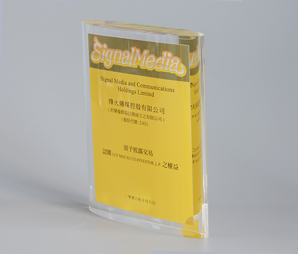 這款亞克力熱壓是采用兩片透明亞克力加一張紙加熱后熱壓成一體,成型后中間是無縫的,完全沒有縫隙和任何痕跡,最后按照客戶的要求將外形打磨成圓邊,光滑圓潤不刮手。