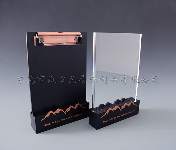 這是兩款用亞克力做的立式文件夾,兩款底座都是用黑色的亞克力制作造型加文字。為了保證擺放穩(wěn)固,在底部灌水泥,背板一款做成黑色亞克力加金屬夾,另一款用兩塊透明板做成盒子形狀。一個(gè)用來夾紙,一個(gè)用來放紙。美觀又實(shí)用。
