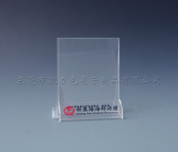 這款亞克力臺(tái)牌采用3mm的優(yōu)質(zhì)亞克力經(jīng)過(guò)切割、雕刻、熱彎、粘接、絲印等工藝制作而成,前面絲印LOGO,正面兩片亞克力夾紙,旁邊粘接一個(gè)圓形的亞克力塊放筆,造型簡(jiǎn)單實(shí)用。