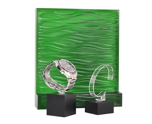 這是一款專為展示品牌手表而生產定作的展示套裝,分別為:主體(1個)手表小展座3個,主體的底部印有手表品牌公司的logo,因主體產品帶有透明性,logo印在底部,在正面也隱約可見。