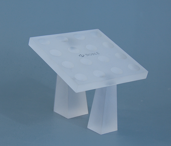 這款亞克力展座是采用亞克力磨砂料通過切割、粘接、絲印、噴砂等工藝制作而成。