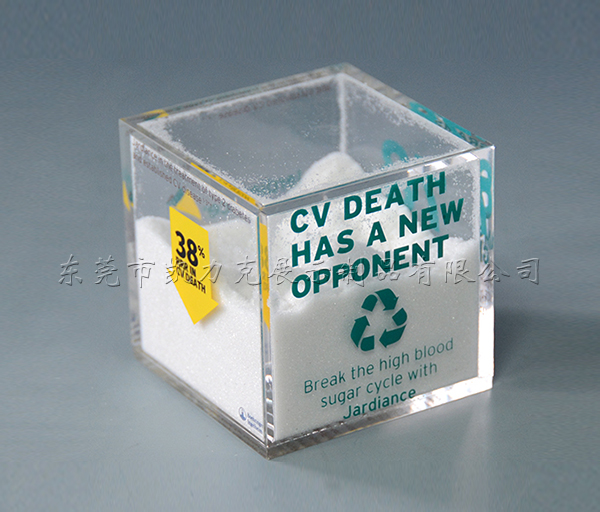 這款亞克力密封盒是采用全新高透的六塊亞克力板粘接而成,,表面光滑透亮,拿在手里舒適有質(zhì)感。里面裝白色細(xì)小顆粒,六面粘死,再在六面絲印文字,起到展示觀賞作用