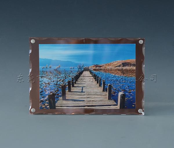 這款有機(jī)玻璃相框是用兩張相同尺寸的一塊透明有機(jī)玻璃加一塊茶色有機(jī)玻璃背板,四角內(nèi)鑲強(qiáng)力小磁鐵吸附而成,在背部做一個(gè)支撐架,簡(jiǎn)單實(shí)用方便快捷。相框橫豎均可自由擺放,并且密封性好可防止照片不泛黃起皺褶。